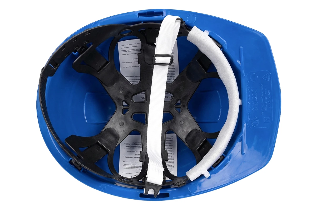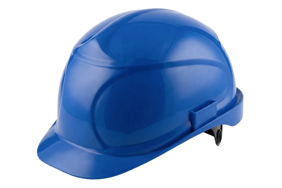 каска строительная с храповым механизмом синяя предназначена для защиты головы работника от ударов, электротравм, осадков, брызг и капель агрессивных субстанций.