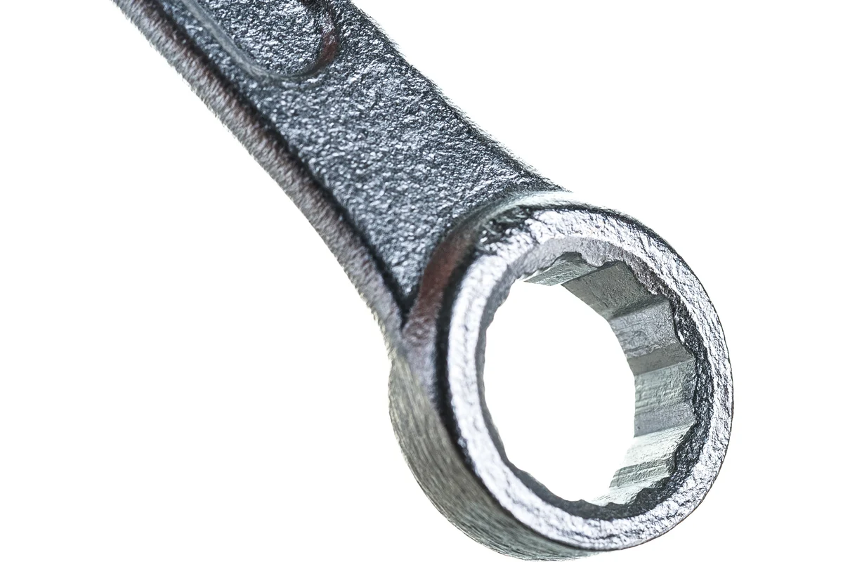 Ключ изготовлен из прочной стали и имеет хромированное покрытие, которое защищает инструмент от коррозии, механических повреждений и преждевременного износа. Хромированная поверхность облегчает очистку и сохраняет аккуратный внешний вид даже при интенсивной эксплуатации. Накидная часть обеспечивает надёжный обхват крепежа и снижает риск срыва граней, а рожковая позволяет быстро работать в ограниченном пространстве.