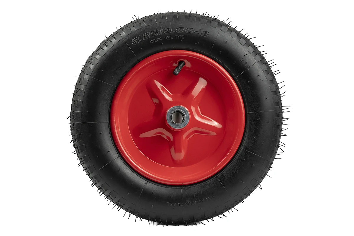 Колесо пневматическое для тачки 3.25/3.00-8 (Ø35–36 см) с посадочным диаметром 20 мм — запасная часть для тележек и тачек, предназначенная для замены изношенных или повреждённых колёс. Пневматическая конструкция обеспечивает плавный ход и снижает нагрузку при перемещении грузов по неровным поверхностям, грунту и строительным площадкам.