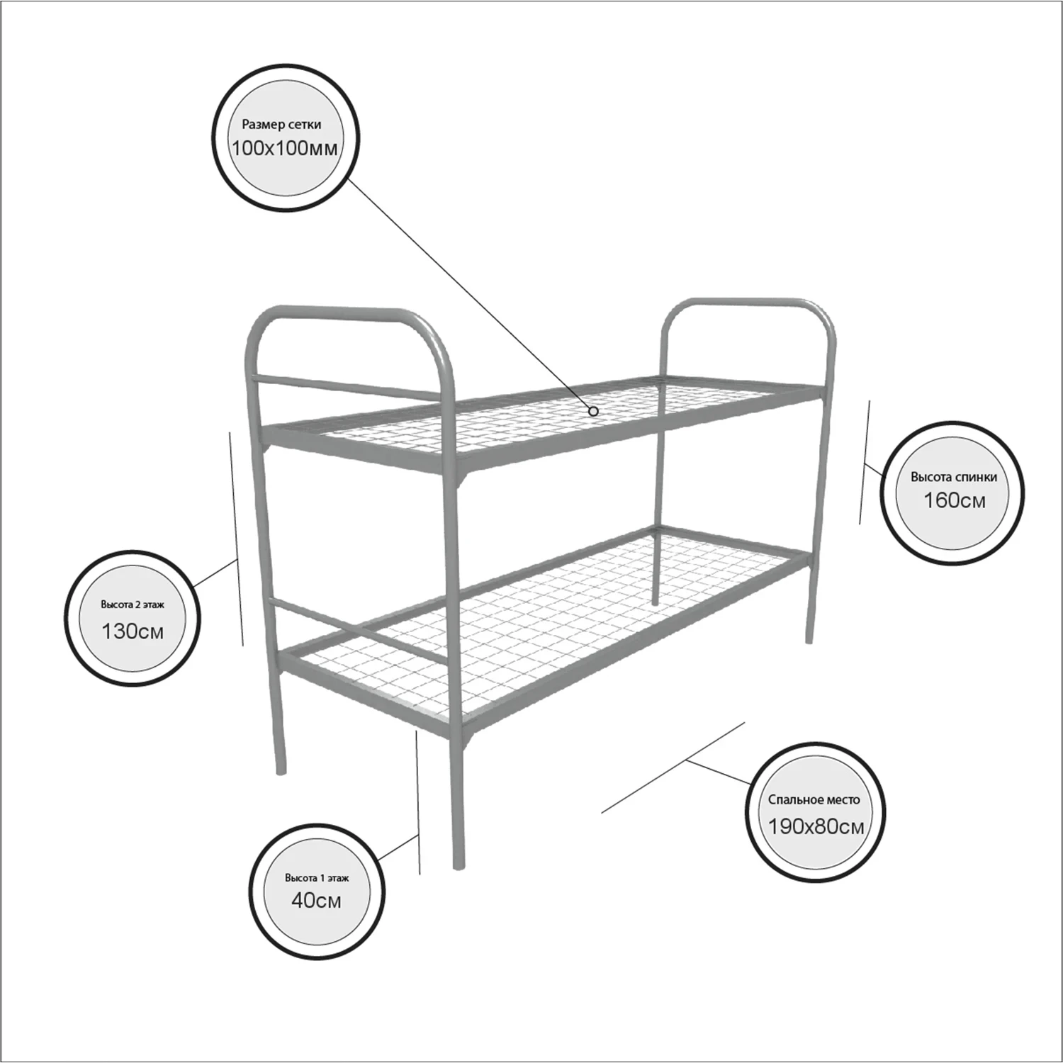 Ширина ложа варьируется от 700 до 900 мм. У нас можно заказать двухъярусную металлическую кровать разных размеров. Изделия легкие в уходе, быстро моются, не доставляют хлопот при уходе за ними.