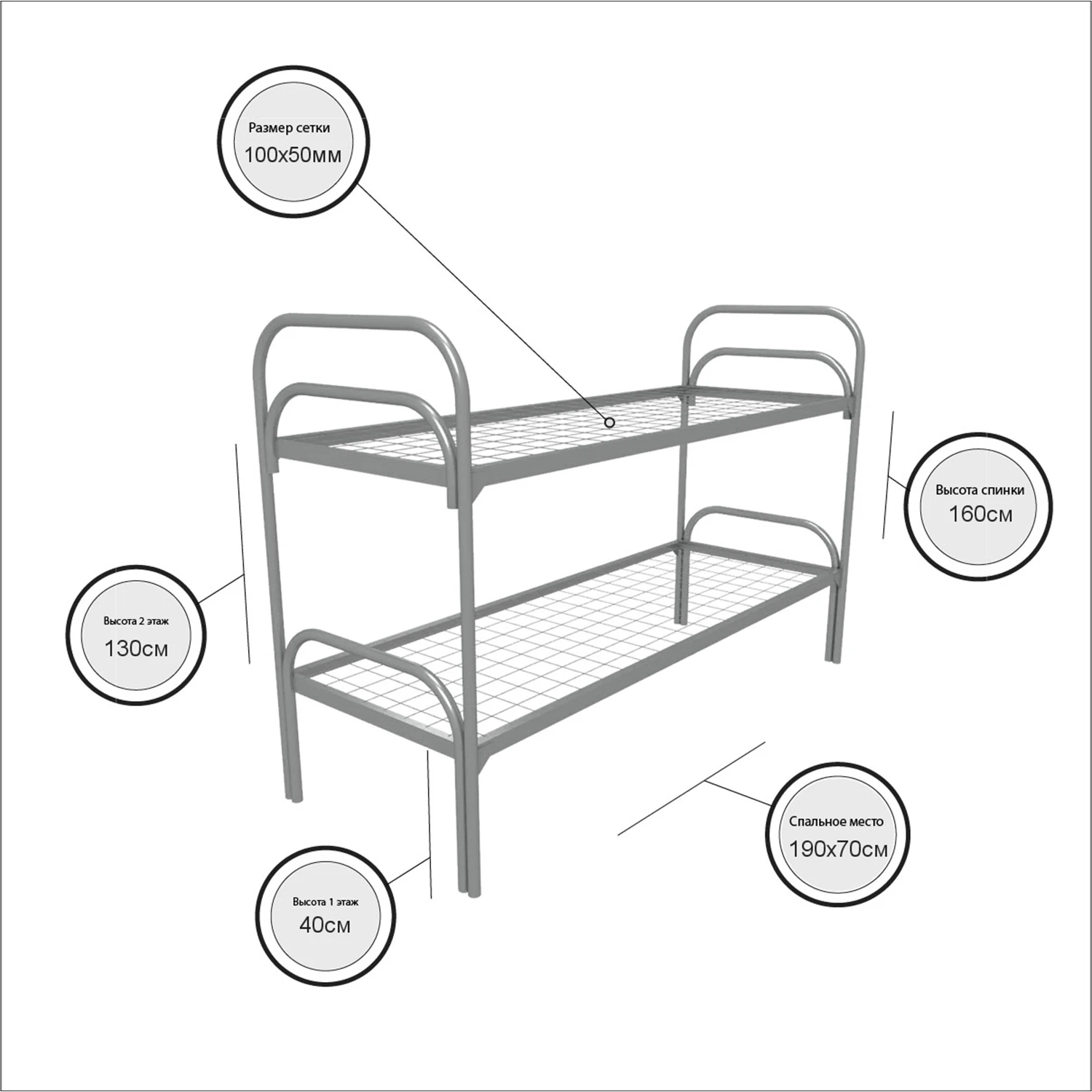 Ширина ложа варьируется от 700 до 900 мм. У нас можно заказать двухъярусную металлическую кровать разных размеров. Изделия легкие в уходе, быстро моются, не доставляют хлопот при уходе за ними.