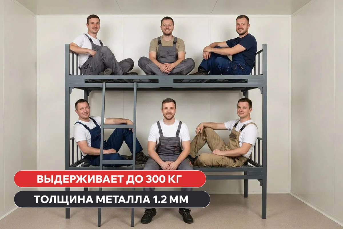 - Металлические двухъярусные кровати для рабочих оснащены прочным каркасом с металлическим основанием, выполненным их стальных труб.