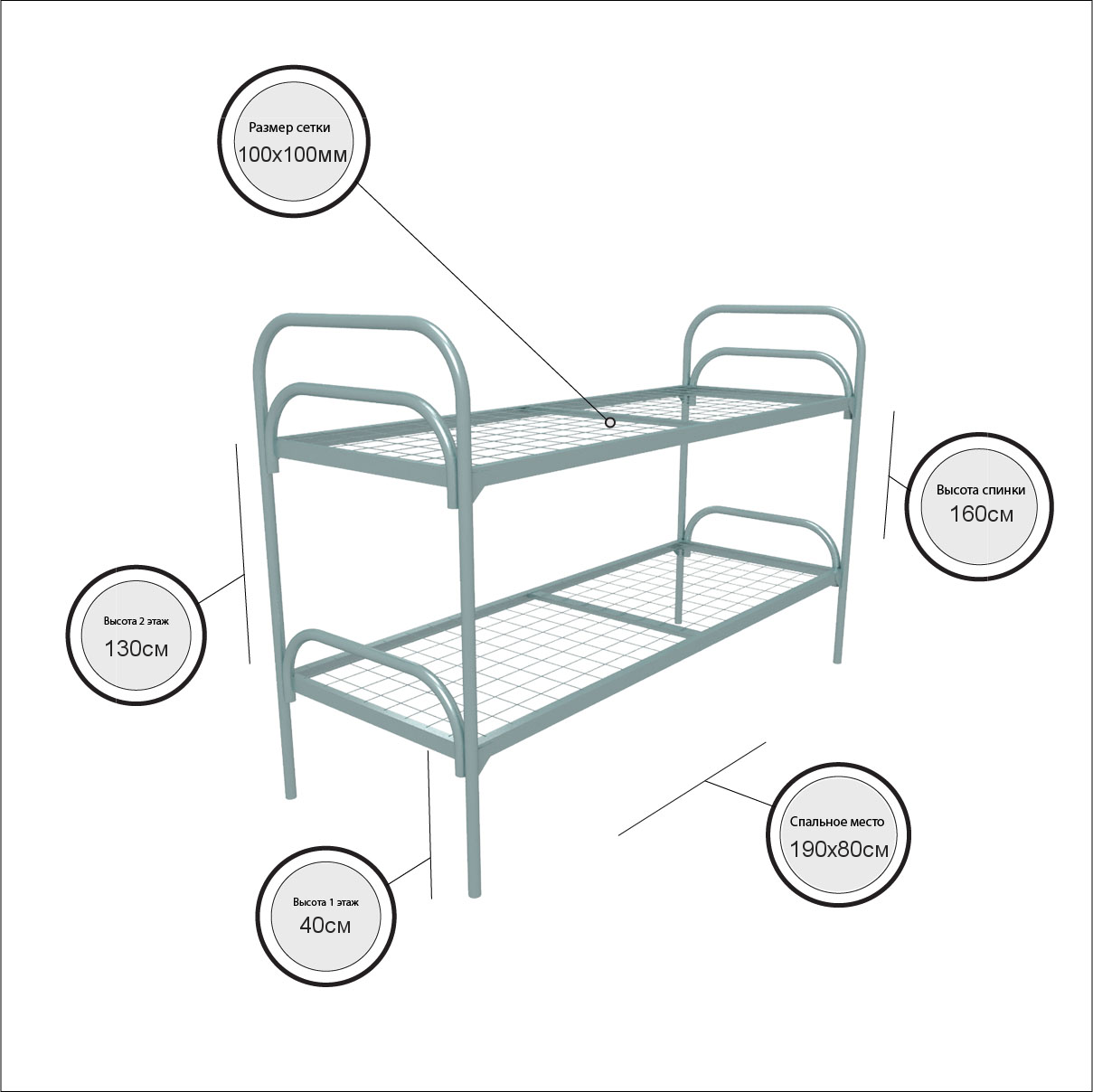 Кровать металлическая двухъярусная "Стандарт +" (800х1900, сетка 100х100, 1 перемычка)
