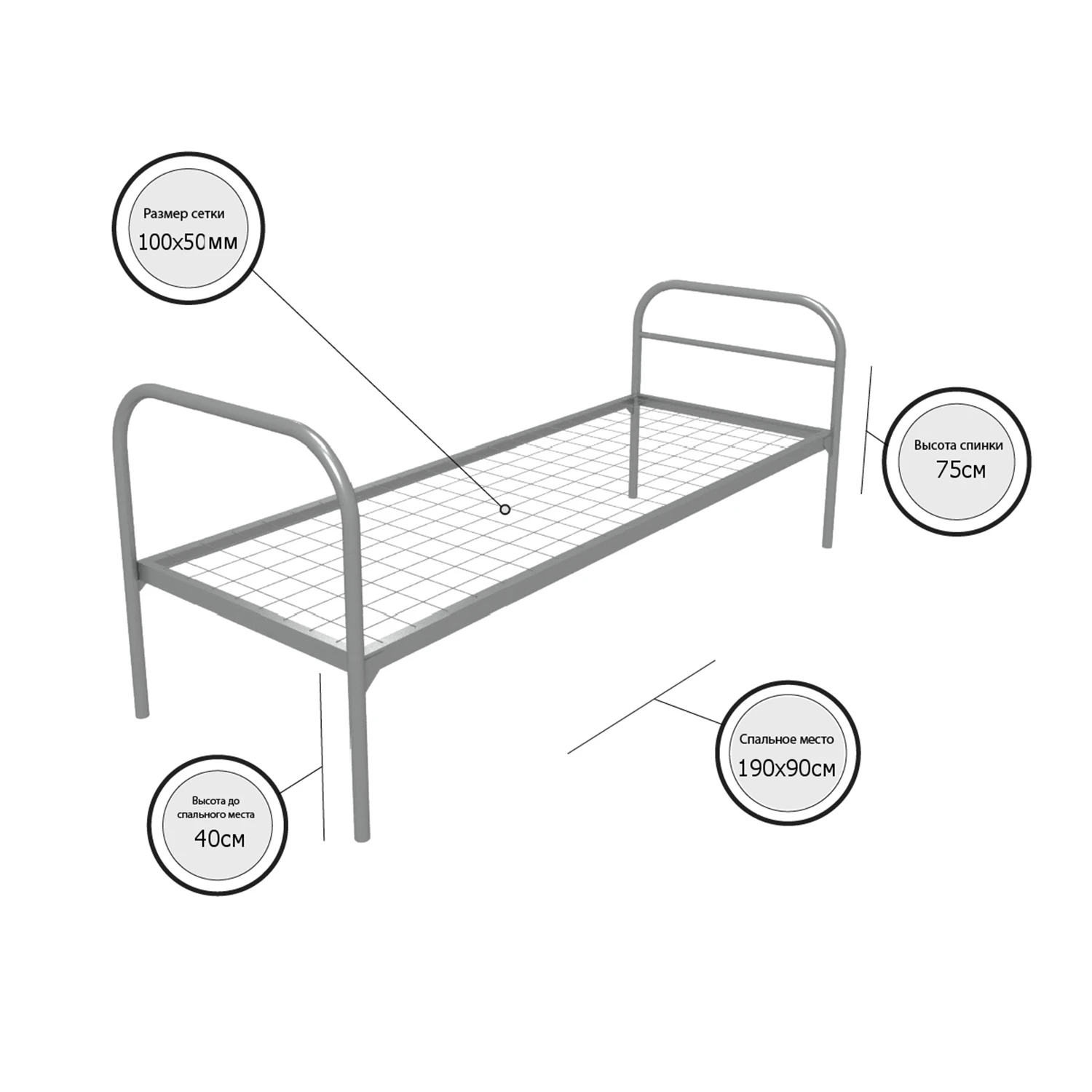 Кровать металлическая одноярусная "Бюджет +" (900х1900, сетка 100х50, 1 перемычка)