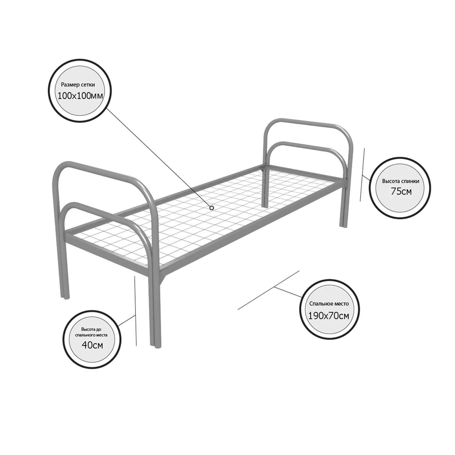 Кровать металлическая одноярусная "Хард" (700х1900, сетка 100х100, двойная ножка)