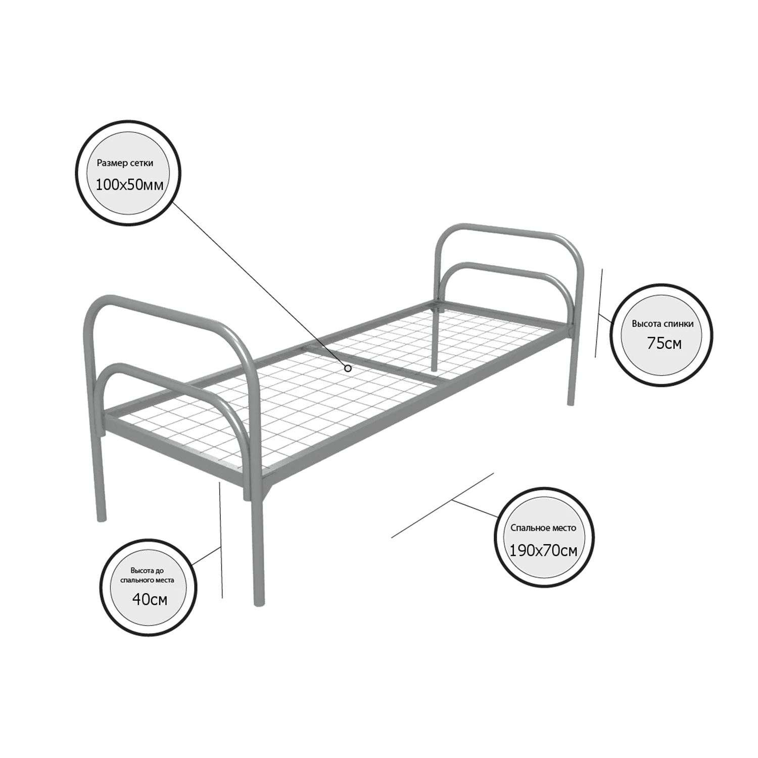 Кровать металлическая одноярусная "Стандарт +" (700х1900, сетка 100х50, 1 перемычка)