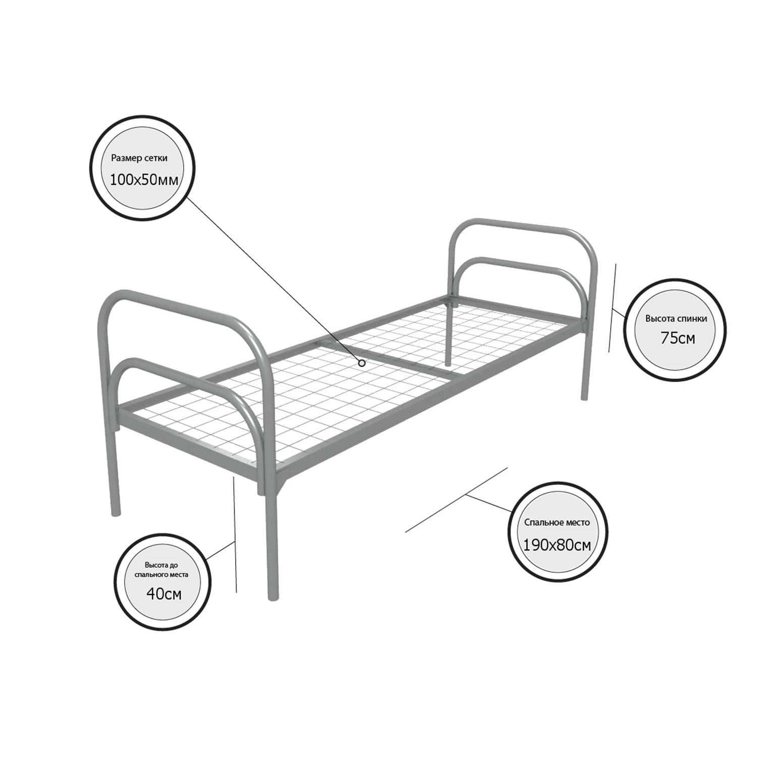 Кровать металлическая одноярусная "Стандарт +" (800х1900, сетка 100х50, 1 перемычка)