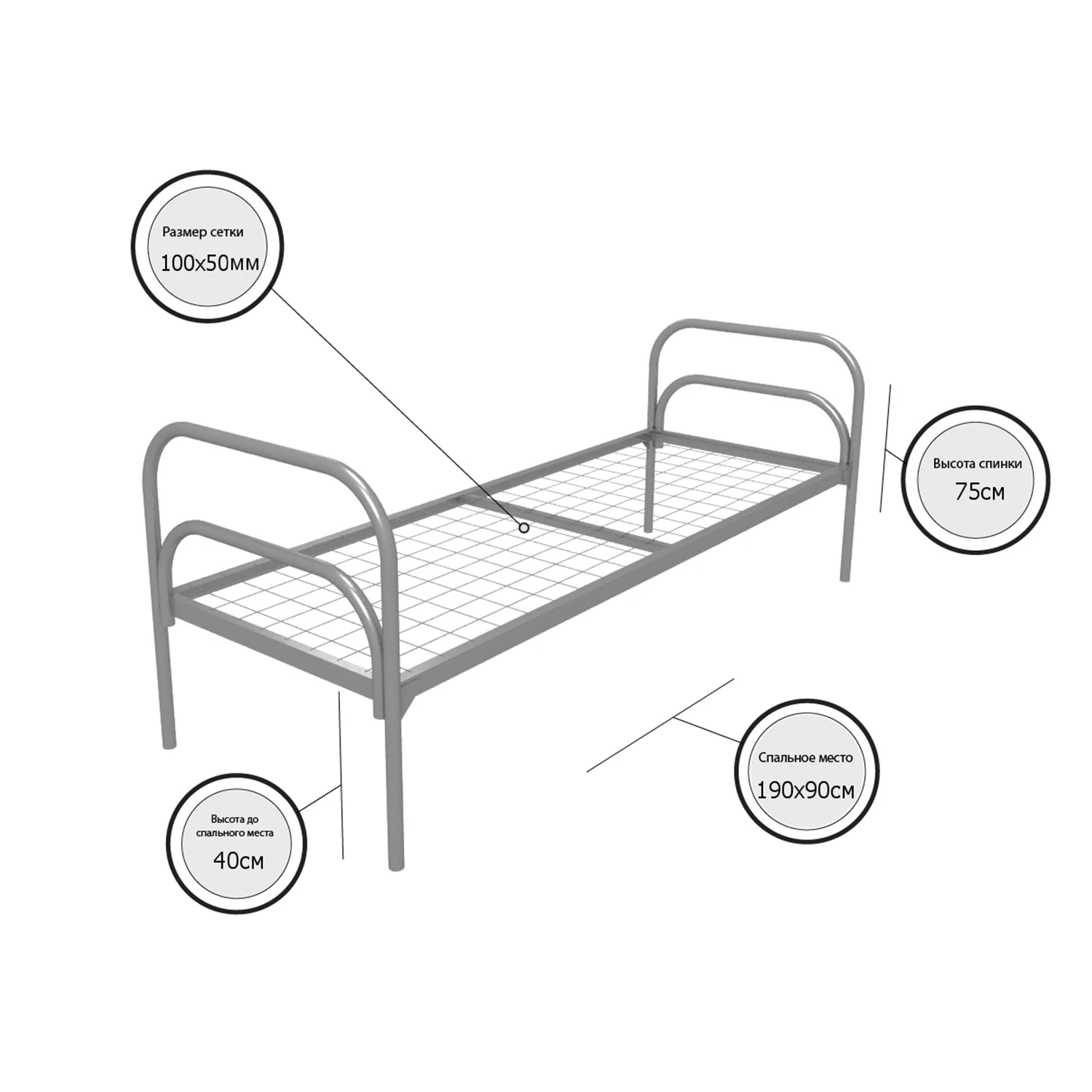Кровать металлическая одноярусная "Стандарт +" (900х1900, сетка 100х50, 1 перемычка)