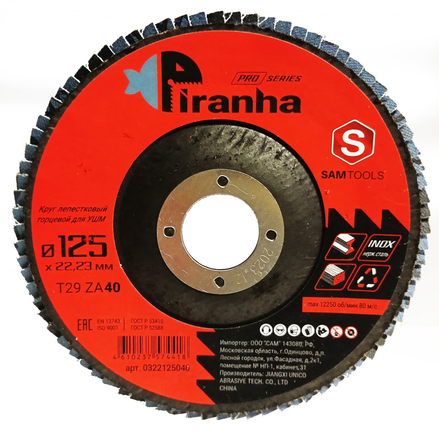 Круг лепестковый торцевой (КЛТ 2) 125 мм P40 SAMTOOLS серия PIRANHA PRO предназначен для угловых шлифовальных машин и подходит для обработки металла, нержавеющей стали, древесины и пластика.Оснастка обладает высокой производительностью съёма и длительным сроком службы. Веерное расположение лепестков обеспечивает плавную работу круга и предотвращает перегрев в зоне шлифования. Тканевая основа равномерно изнашивается, открывая следующий слой абразива, что позволяет полностью использовать ресурс круга.