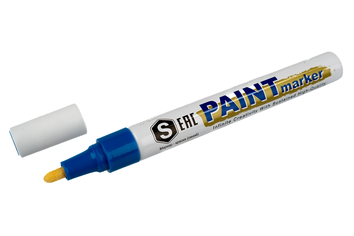 Маркер-краска строительный (paint marker) , синий– профессиональный разметочный инструмент, использующийся в строительстве и при ремонте в различных плотницких, малярных, монтажных работах. Маркер-краска позволяет намечать места сверления и обозначать линии распила, наносить риски и прочерчивать углы, а также отмечать другую разметку и маркировку. Материал для нанесения разметки может быть различным: стекло, камень, металл, пластик, дерево и др. Для таких работ на строительных площадках используют профессиональные маркер-краски с дозированной подачей краски, которая исключает растекание и дает однородную линию, а жесткое перо обеспечивает четкость линий. Нанесенные маркер-краской линии устойчивы к УФ-излучению и сложным погодным условиям.Перед началом использования обязательно потрясите маркер и несколько раз надавите на стержень, как в нашем видео. Таким образом маркер напитается краской и Вы сможете рисовать им. Высыхание происходит не сразу! Необходимо подождать 10-15 секунд, тогда маркер уже не сотрется.