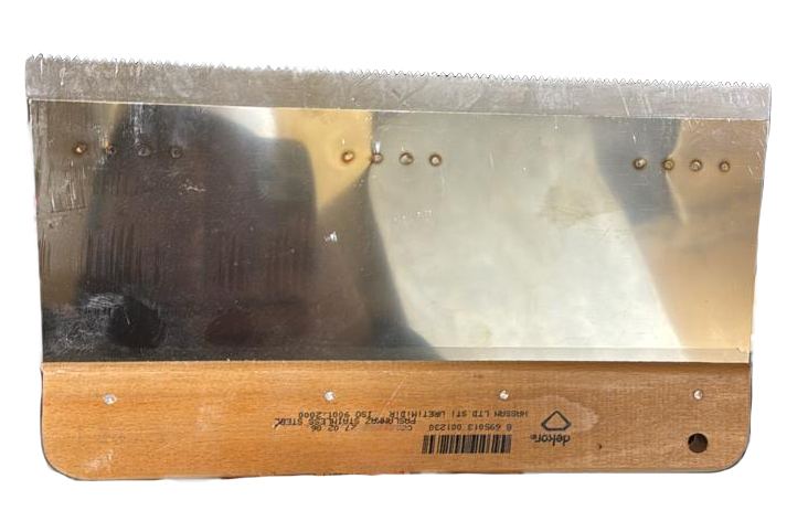 Шпатель-гребень Dekor размером 80х300 мм с зубцами 8х8 мм предназначен для эффективного нанесения и распределения различных отделочных материалов, таких как клеи и штукатурки. Изготовленный из нержавеющей стали, этот инструмент отличается высокой прочностью и устойчивостью к коррозии, что обеспечивает долговечность и надежность в эксплуатации. Деревянная ручка обеспечивает комфортный и надежный захват, позволяя мастеру легко управлять шпателем и добиваться отличных результатов.Шпатель-гребень Dekor станет незаменимым помощником как для профессиональных отделочников, так и для домашних мастеров, стремящихся к качеству и аккуратности в своих проектах. С его помощью вы сможете равномерно наносить материалы, создавая идеальное основание для дальнейших отделочных работ.