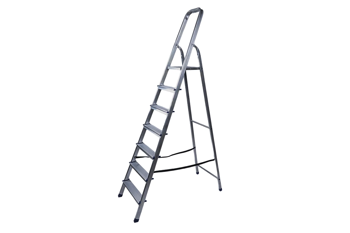 Каркас стремянки изготовлен из прочного алюминиевого профиля, который сочетает малый вес и устойчивость к коррозии. Семь ступеней обеспечивают удобный подъём и позволяют безопасно работать на более высокой точке по сравнению с компактными моделями. Конструкция рассчитана на стабильное положение пользователя и сохраняет жёсткость при регулярной эксплуатации.