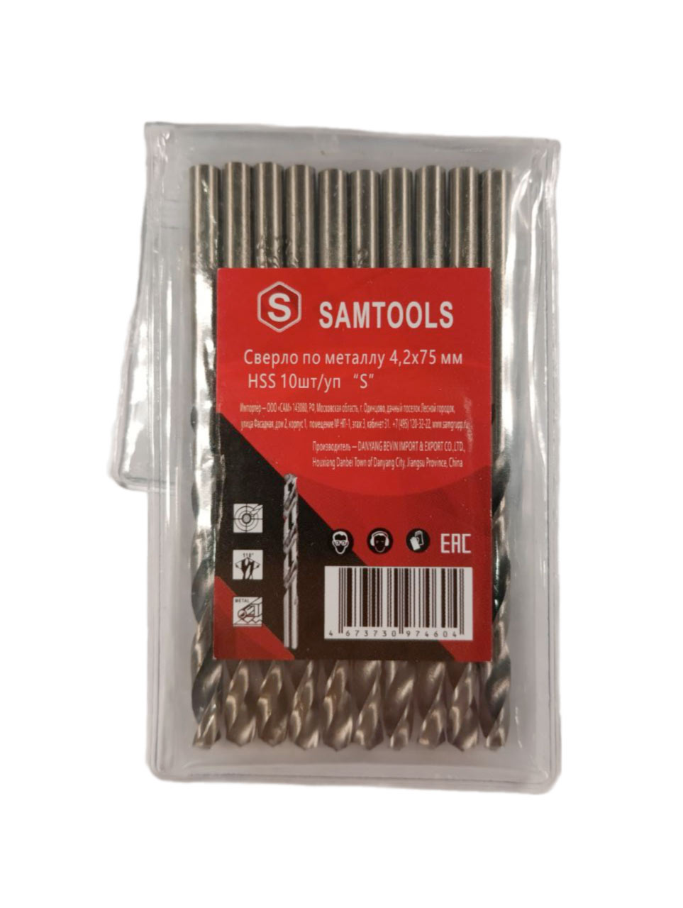 Спиральное (винтовое) сверло по металлу HSS 4.2х75 мм (10 штук в упаковке) Samtools от Samgrupp - расходное комплектующее для электроинструмента, применяемое при высверливании отверстий в металлах и стали. Выполнено из полированной HSS стали.В каталоге нашей компании представлены сверла разных размеров.