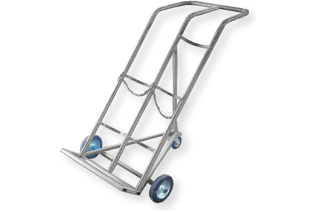 Тележка Серии КП-2 предназначена для перевозки двух баллонов (кислород-пропан, ацетилен-пропан и т.д.) или других аналогичных баллонов на складах, базах и цехах предприятий. Конструкция сварная, выполнена из металлической трубы. Фиксация баллона оцинкованной цепью. Наличие третьего поворотно-опорного колеса Ф-160 мм.Тележки для двух разновидных газовых баллонов - это удобное и практичное приспособление для транспортировки емкостей с кислородом и пропаном на строительных площадках и на производственных участках, где выполняются сварочные работы.