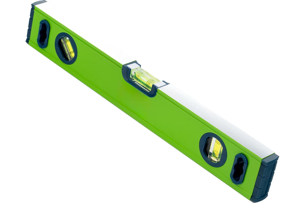 Корпус уровня выполнен из прочного алюминиевого профиля, устойчивого к деформации и механическим нагрузкам. Встроенные магниты обеспечивают надёжную фиксацию инструмента на металлических поверхностях, что упрощает монтажные операции и повышает точность измерений. Три измерительных глазка позволяют контролировать горизонталь, вертикаль и дополнительное угловое положение, расширяя функциональность инструмента.