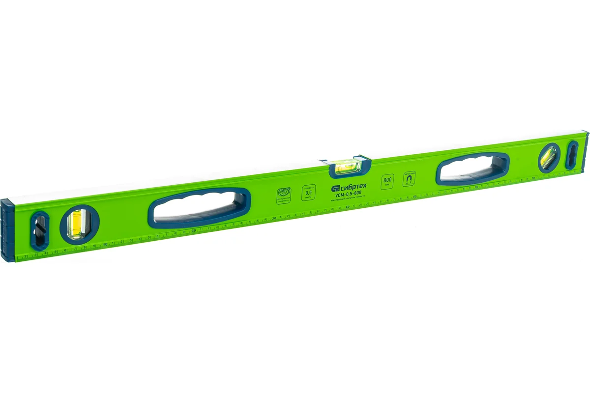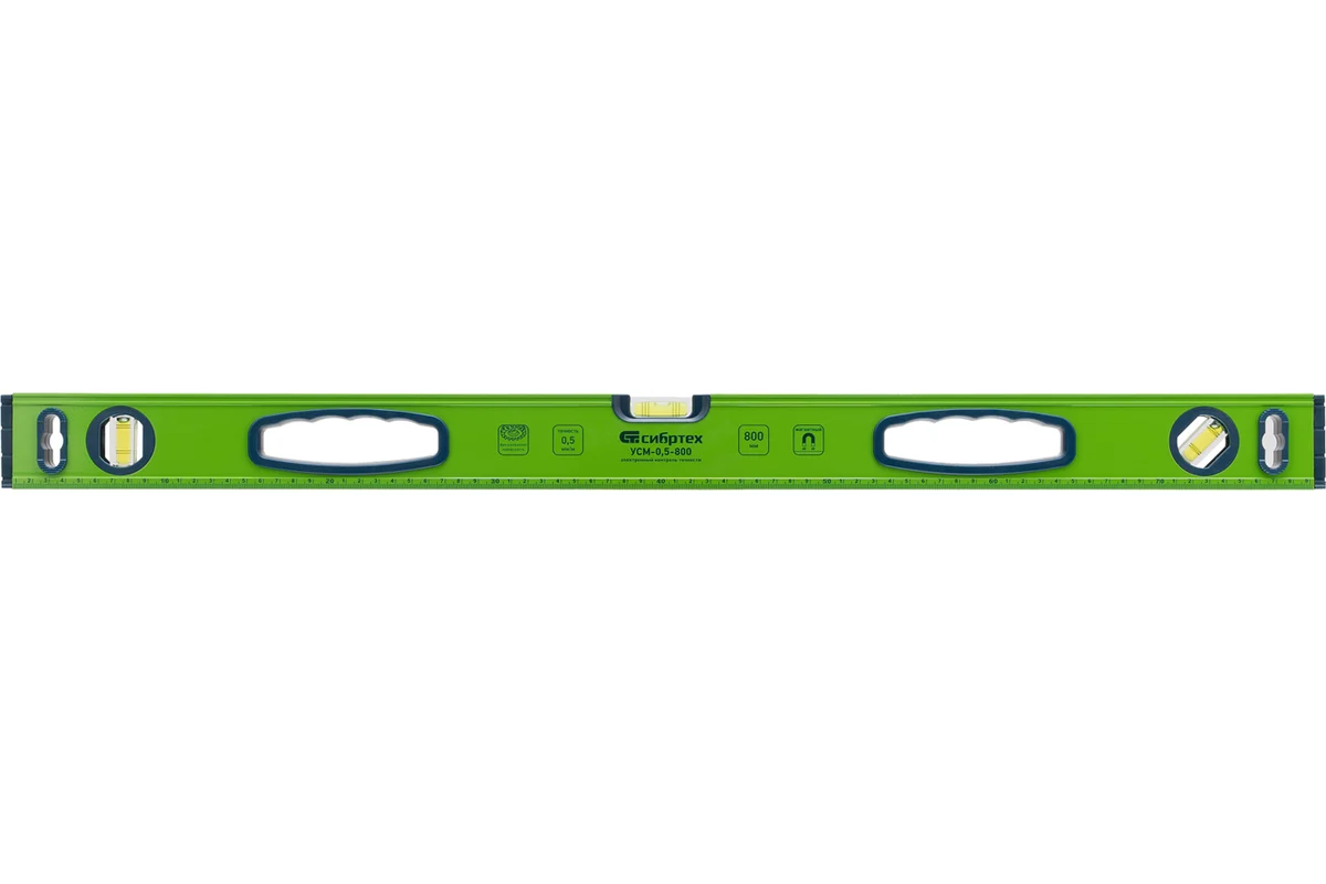 Для удобства эксплуатации уровень оборудован эргономичными рукоятками, облегчающими переноску и работу на объекте. Длина 800 мм оптимальна для выравнивания элементов средней и большой протяжённости, сочетая удобство и точность. Магнитный уровень Сибртех УСМ-0,5-800 — практичный и надёжный инструмент для профессионального и бытового применения.