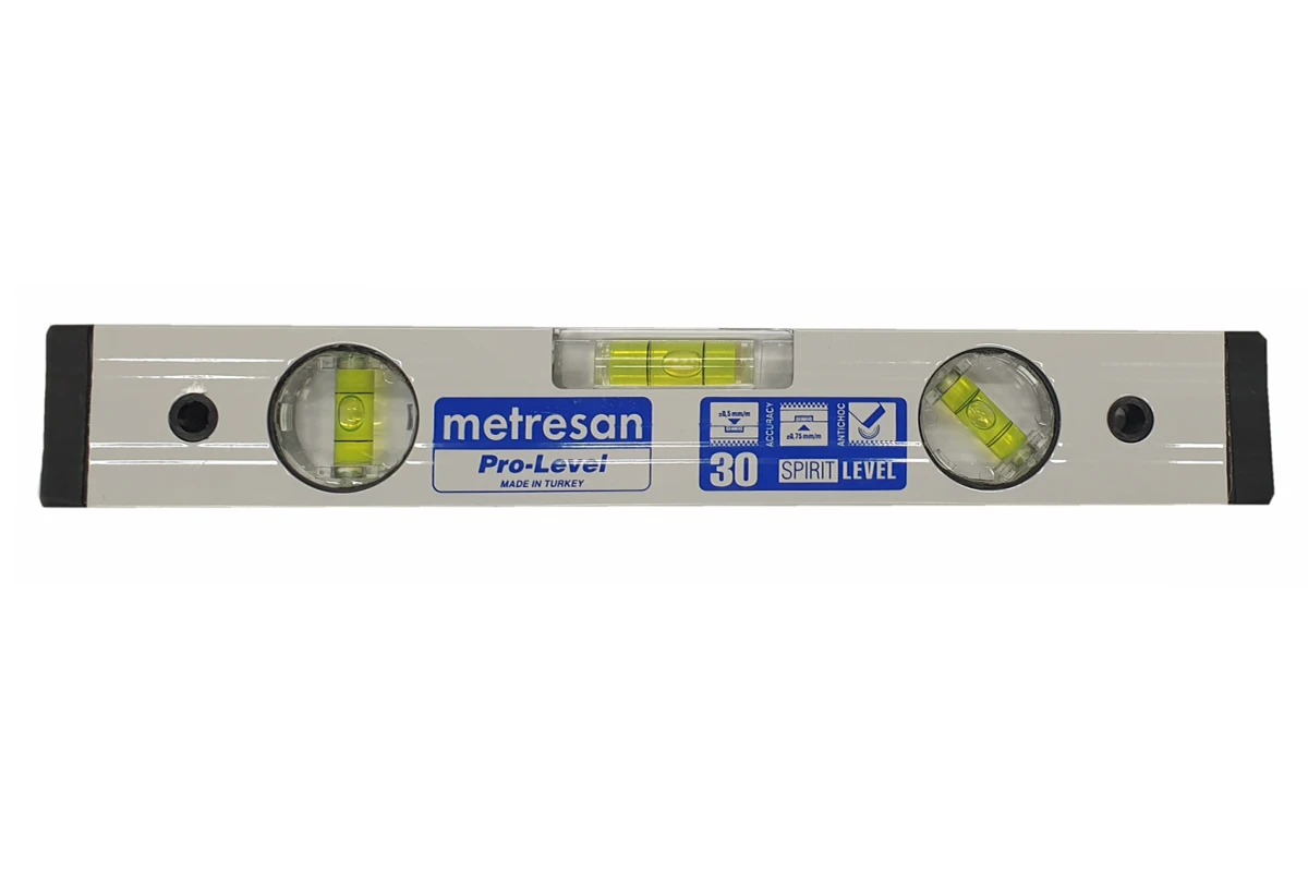 Алюминиевый строительный уровень 300 мм пузырькового типа серии Pro-Level 3турецкой компании Metresan предназначен для профессионального использования.Модели уровней сделаны из экструдированного алюминия. Рельефный корпус инструмента дает дополнительное удобство при захвате, а прорезиненные вставки в торцевых частях корпуса делает строительные уровни Metresan устойчивыми к дарам. Горизонтальное (180°) крепление регулируется винтами по бокам. Погрешность 0,5мм/м.