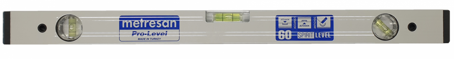 Алюминиевый строительный уровень 600 мм пузырькового типа серии Pro-Level турецкой компании Metresan предназначен для профессионального использования.Модели уровней сделаны из экструдированного алюминия. Рельефный корпус инструмента дает дополнительное удобство при захвате, а прорезиненные вставки в торцевых частях корпуса делает строительные уровни Metresan устойчивыми к дарам. Горизонтальное (180°) крепление регулируется винтами по бокам. Погрешность 0,5мм/м