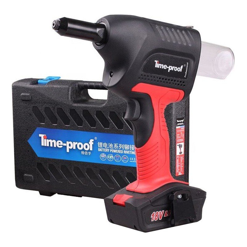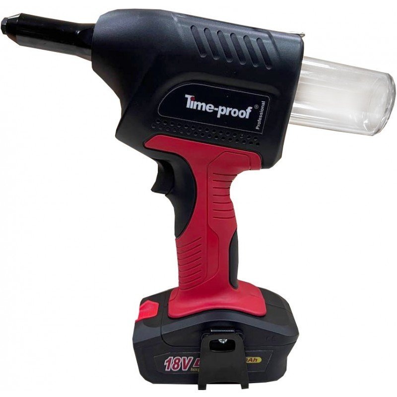 Time-proof TDC5000 - это профессиональный инструмент для монтажа вытяжных заклепок диаметром от 2.4 мм до 5.0 мм. Оснащен бесщеточным двигателем с силой вытягивания в 12000N, что позволяет с легкостью устанавливать заклепки даже 5.0 мм из нержавеющей стали. Комплектуется 2-мя батареями 18 В Li-Ion 2.0 Ач и зарядным устройством. Аккумуляторы оснащены индикатором заряда батареи.